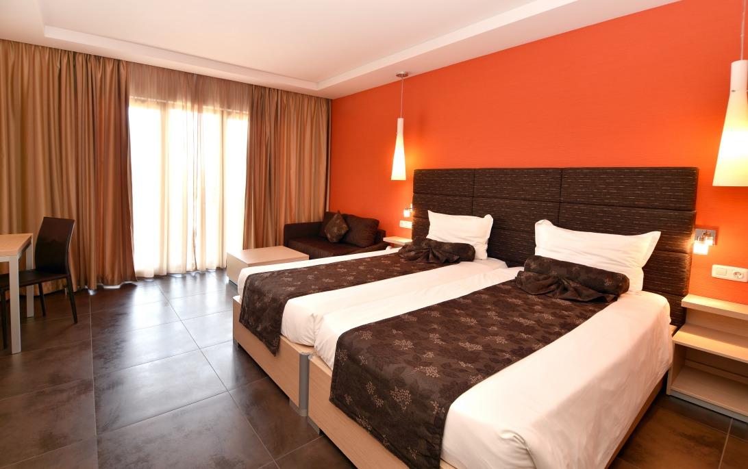 • Kétágyas szoba (park/ tengerre néző): 172 park, 59 tenger, kb. 32 m², max. 2+1 / 3+0, 2 ágy (100×200 cm), összecsukható fotel. Fürdőszoba zuhannyal vagy káddal.